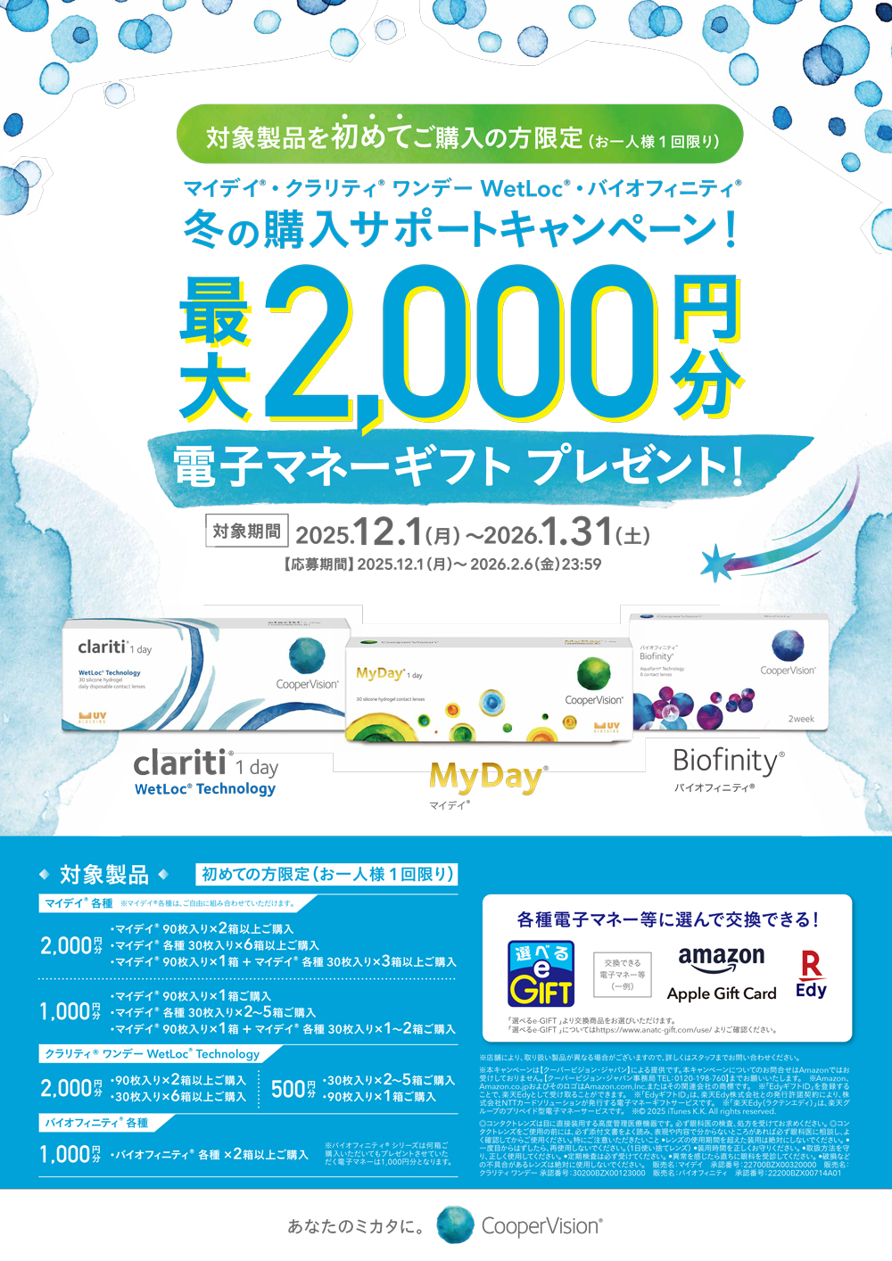 - 期間中、対象レンズを新規で2枚1組購入された方にケアセットプレゼント!